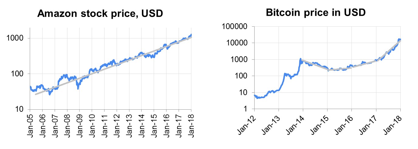 В противоположность этому, темп роста курса биткойна продолжает ежегодно увеличиваться по супер-экспоненциальной модели, начиная с 2015 года, что прямо указывает на пузырь биткойна. При возникновении пузыря риск краха или, как минимум, серьезной коррекции рынка существенно возрастает. Было выдвинуто немало теорий, объясняющих, как и когда возникают и лопаются биржевые пузыри, но, в конечном счете, до тех пор, пока они не лопнут, ничего конкретного предсказать нельзя.