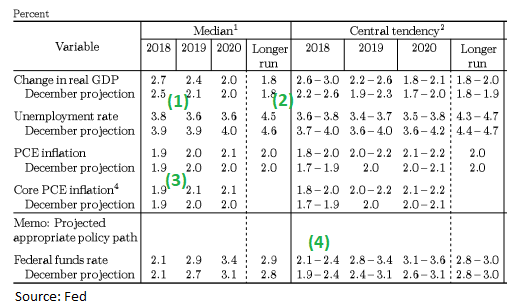 Федрезерв ожидаемо повысил ставку на 0.25% пункта, при этом сохранив средний прогноз на ещё 2 повышения ставки в течение 2018-го. Тем не менее, FOMC выразил уверенность в отношении экономических перспектив. Оценки роста экономики на текущий и следующий год были повышены, а уровня безработицы – снижены. Это вылилось в пересмотр ожиданий по ставке на 2019 год с двух до трёх раз. Впрочем, хотя средний прогноз по ставке на этот год не изменился, всё же число сторонников более активного повышения выросло (4).