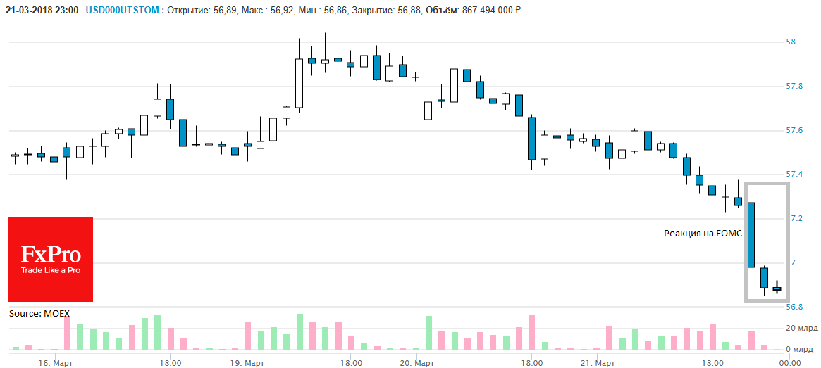 Последние котировки пары USDRUB вчера ночью были на уровне 56.88 (-65 копеек за сутки). Нефть немного корректируется утром, что может обернуться ростом доллара вплотную к 57 на старте торгов.