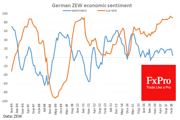 В 12:00 МСК в Германии публикуется индекс текущей ситуации от института ZEW (апр), ожидается значение 88.0 против прошлого на 90.7. Также публикуется индекс настроений в деловой среде от института ZEW (мар), ожидается значение -1.0 против 5.1 ранее. Эти данные, как прогнозируется, покажут снижение из-за влияния роста евро на бизнес. Ухудшение ситуации в торговой среде также стало встречным ветром для деловых перспектив. Это первый отрицательный прогноз по настроениям со времён Brexit. Кроссы с евро могут оказать под воздействием этих данных.