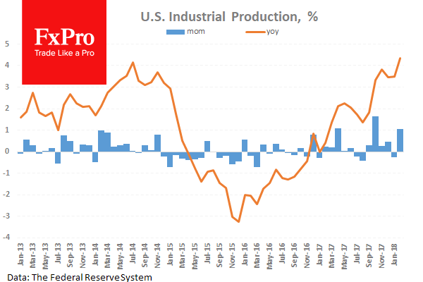 В 16:15 МСК публикуется изменение объёма промышленного производства в США (м/м) (мар). Прогнозируется 0.4% против 0.9% ранее, которые были пересмотрены в сторону снижения с 1.1%. Индекс существенно отскочил, достигая максимума с декабря 2014 года. Также будет опубликован уровень загрузки производственных мощностей (мар), прогнозы указывают на 77.9% против 77.7% ранее.
