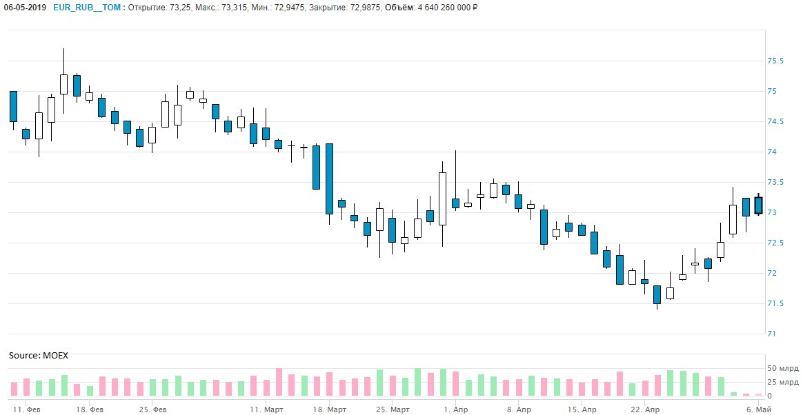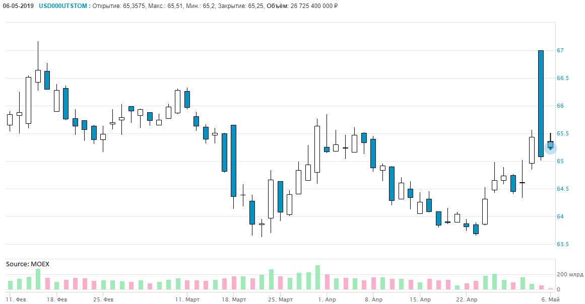 Дональд Трамп, неожиданно для рынков, объявил о повышении пошлин на ряд китайских товаров до 25%. Это стало шоком для трейдеров глобального рынка, которые приготовились к благополучному разрешению торгового конфликта уже на этой неделе. Теперь главный тренд начала недели – это переход на безопасные активы, а потому USDRUB успела подняться до 65.50 (области максимумов апреля) – и это явно не предел. EURRUB также прибавляет с начала дня 23 копейки до 73.17, приближаясь к пикам прошлого месяца.