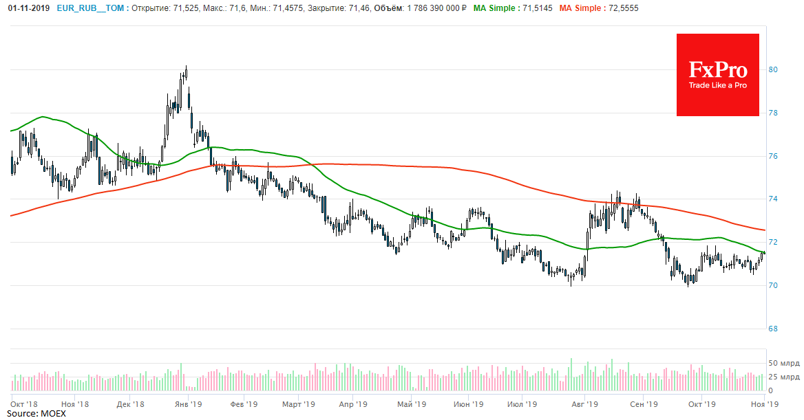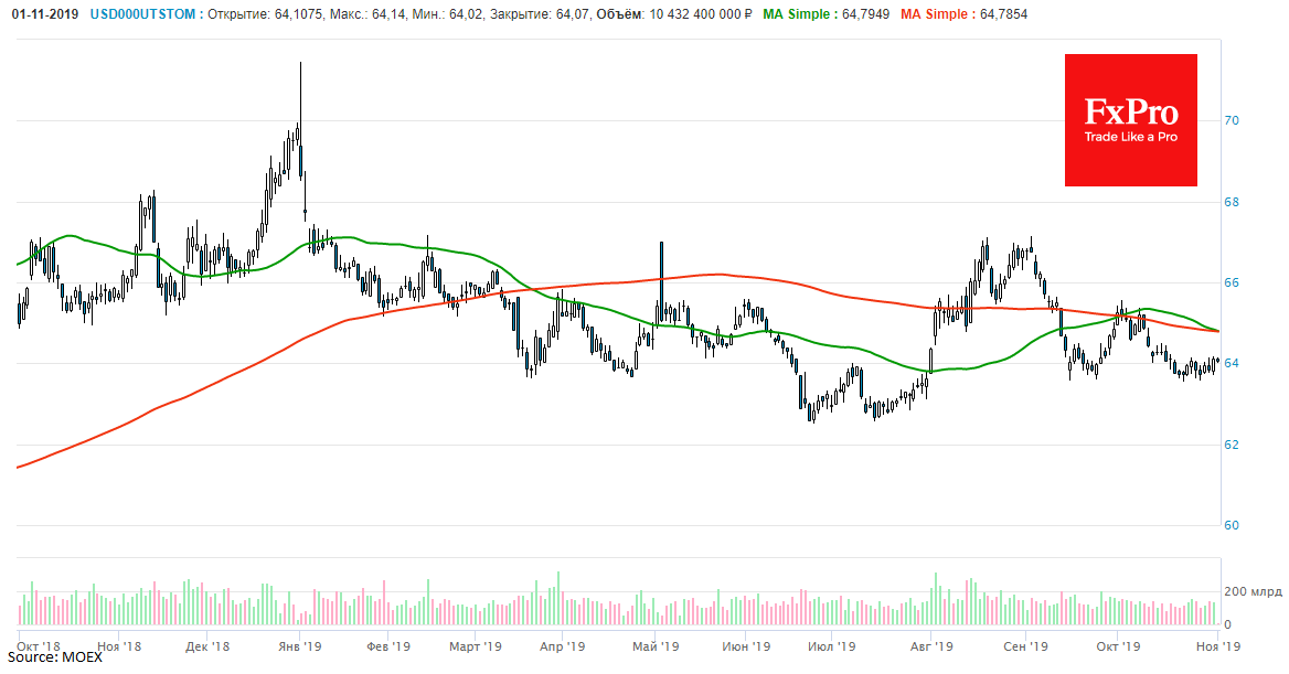 Доллар оказался под давлением после сравнительно мягких комментариев ФРС в среду вечером. Тем не менее, общее ослабление доллара к большинству основных валют не было поддержано отступлением к рублю. USDRUB превысил круглую отметку 64.0, завершив четверг на уровне 64.13, несмотря на ослабление индекса доллара на 0.5% после решения ФРС. EURRUB превысила 71.50 по итогам торгов в четверг -- в область полуторамесячных максимумов – хотя и откатывается на 3 копейки ниже этой отметки в пятницу утром.