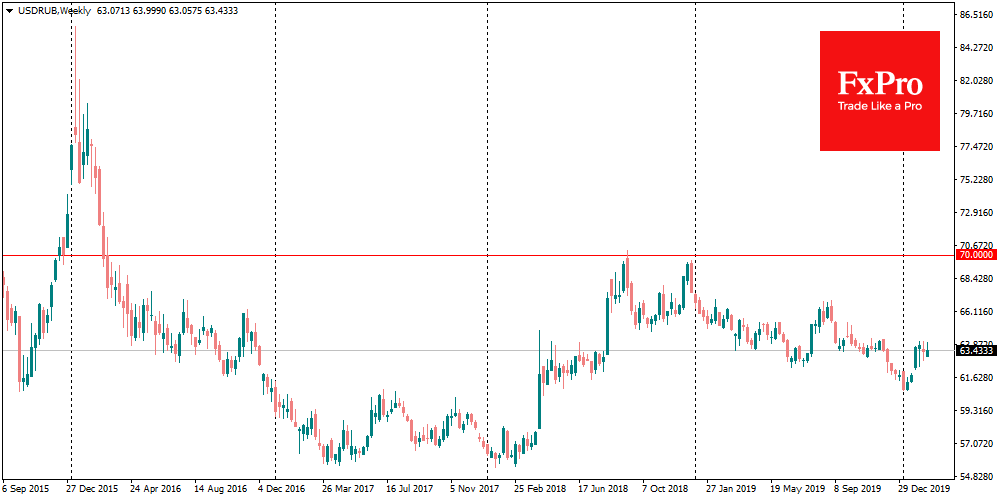 Рубль пока стоит в стороне от общего тренда ослабления развивающихся стран. USDRUB курсирует под 64.00, что заметно ниже области пиковых значений последних лет на 70.00.