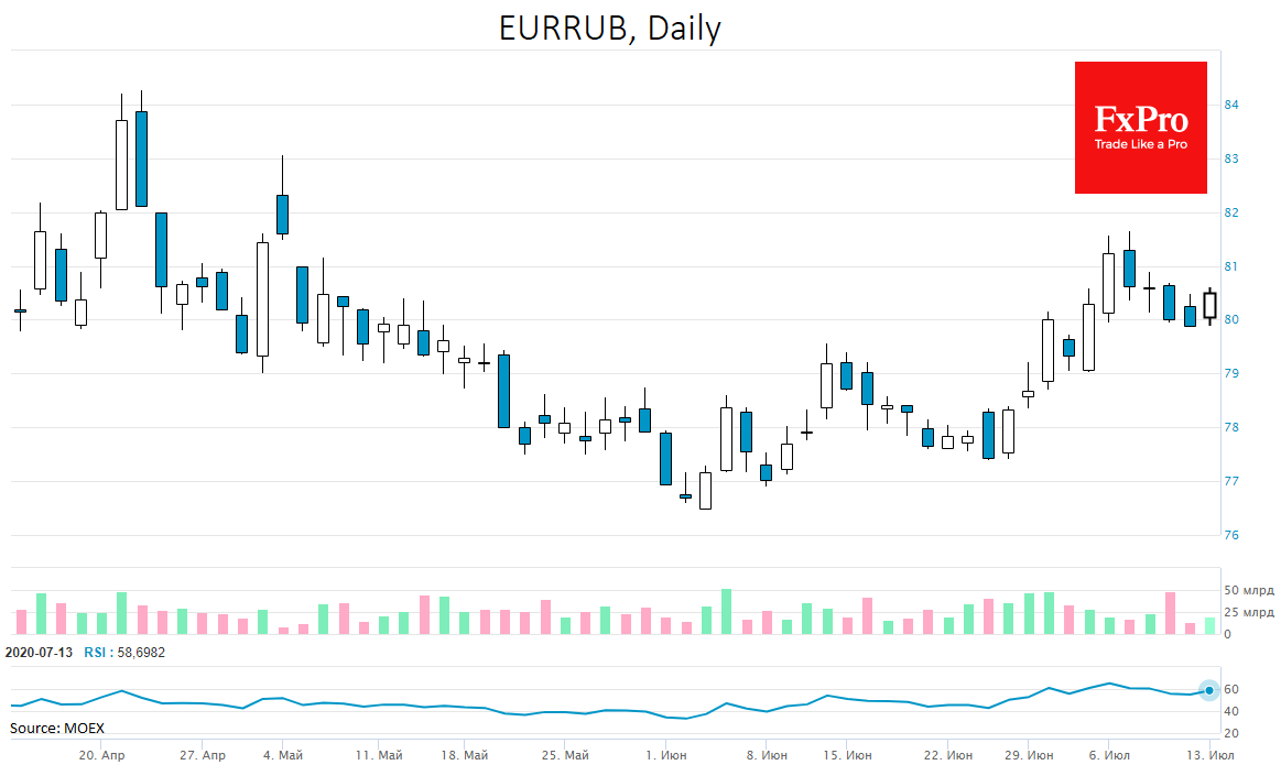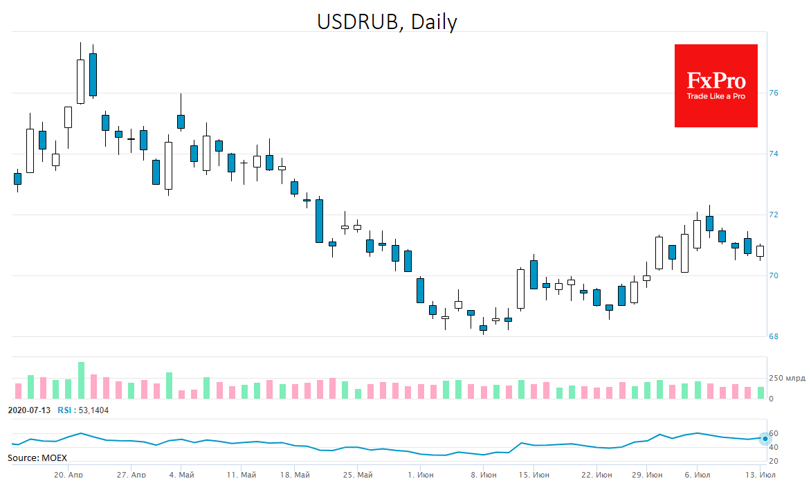 Рублю приходится выбирать, за чем следовать. Финансовые рынки по большей части сохраняют позитивный настрой: Nasdaq 100 почти ежедневно в июле переписывает исторические максимумы, китайский индекс голубых фишек China A50 прибавляет 15% с начала июля. На мировом валютном рынке доллар медленно, но верно отступает все это время, что также является отражением восстановления спроса на рисковые активы.