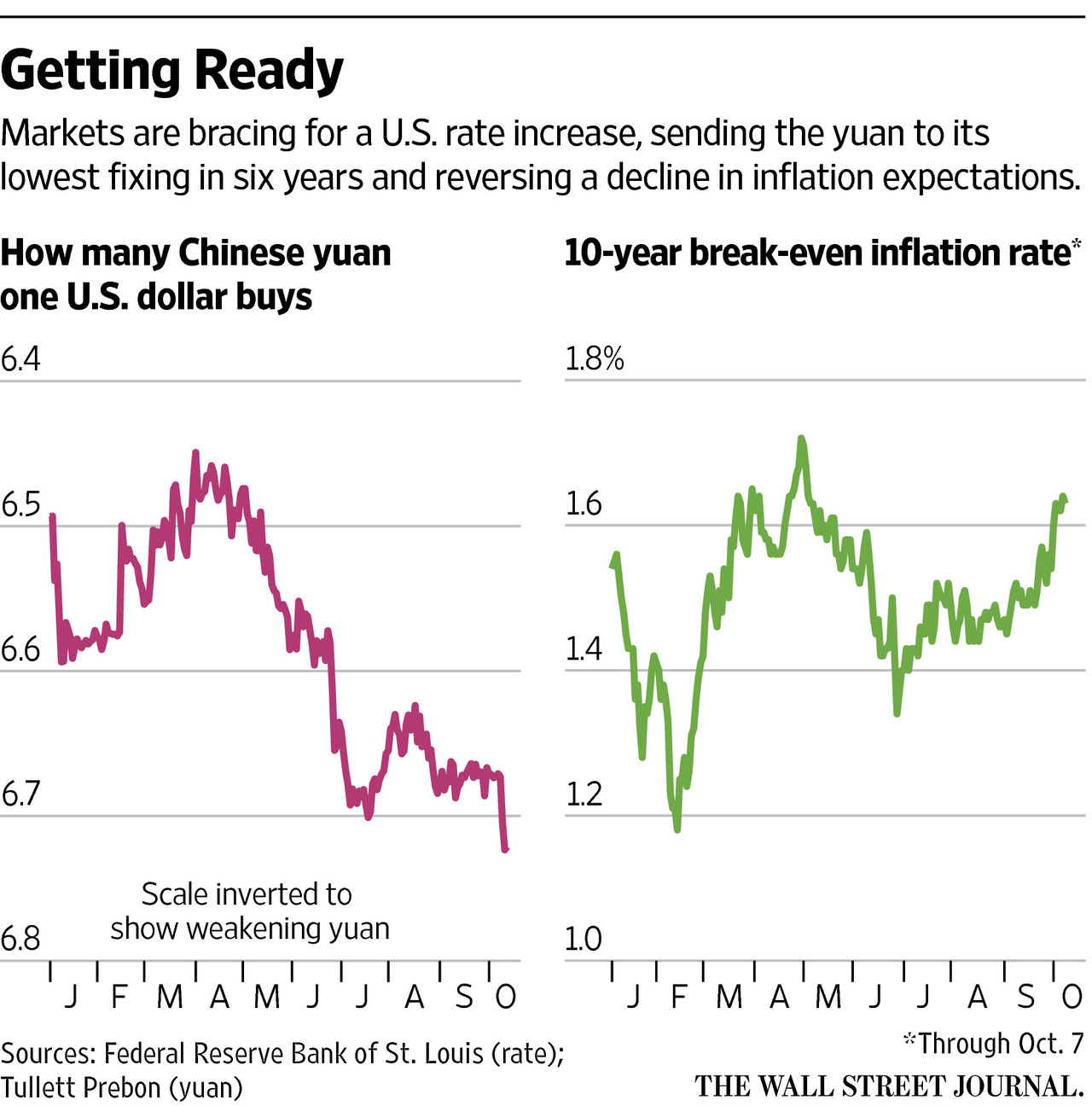 Октябрьский рост доллара пробуждает опасения в отношении уязвимости финансовых рынков к повышению ставки ФРС. Индекс доллара WSJ рос восемь из последних 10 торговых дней, превысив весенний максимум. Валюта выросла на 2.4% в этом месяце. Китай установил в среду справочный курс юаня на минимуме за 6 лет, тогда как валюты основных развивающихся рынков Бразилии, России и Мексики снижались против доллара.