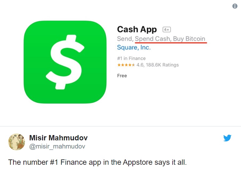 В этом примере биткоин-евангелиста Мисира Махмудова (Misir Mahmudov), крупнейшее финансовое приложение в Apple Store для iPhone под названием Square Cash App предлагает пользователям “тратить деньги, покупать биткоин”. Мудрый совет в описании приложения.