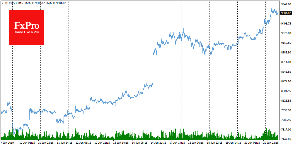 На выходных Биткоин обновил 15-месячные максимумы, достигая в какой-то момент $11200. С утра в понедельник наблюдался откат в область $10500, однако на момент написания, курс поднялся уже до $10800. На данный момент эту динамику сложно назвать коррекцией. На прошлой неделе BTC последовательно рос в сторону пороговых $10000 вместе с таким же последовательным увеличением торговым объемов. Затем все сложилось в идеальные условия для нового скачка.