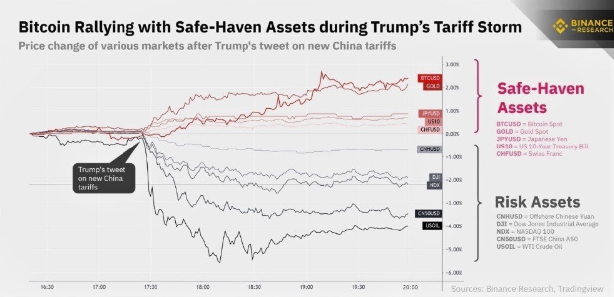 Тем не менее, чтобы подкрепить свою точку зрения, Binance опубликовали в Твиттере график, который показал корреляцию динамики цен на BTC, золота, американских десятилеток и валют-гаваней, включая швейцарский франк. Большинство людей знает, что корреляция не является причинно-следственной связью. Однако Binance попытались связать торговую риторику Трампа с ростом цен на биткоины. Они не представили никаких других доказательств в поддержку этого аргумента.