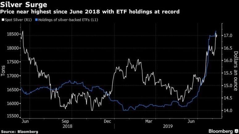 Золото показывает лучшую неделю с 2016 года: импульс роста толкнул драгметалл выше $1,500 за унцию, серебро торгуется около 14-месячного максимума. Оба металла выросли на фоне опасений относительно перспектив для мировой экономики и по мере того, как центральные банки по всему миру продолжают снижать процентные ставки. Длительная торговая война между США и Китаем также привела к увеличению спроса на безопасные активы, причем трейдеры и аналитики в еженедельном обзоре Bloomberg почти единогласно ставят на рост цен на золото.