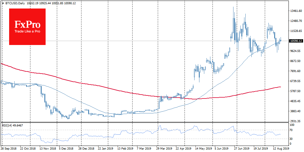 Быки в очередной раз поддержали биткоин, не дав провалиться ниже $9,700. В начале рабочей недели BTC получил новый импульс для роста за счет новостей от Bakkt, которые все-таки получили разрешение на запуск поставочных фьючерсов. Благодаря поддержке со стороны новостного фона, биткоин вернулся выше 50-дневной скользящей средней. Утром во вторник он торгуется выше $10,800, показав за последние сутки прирост почти в 3% и добавив 15% к минимумам прошлого четверга.