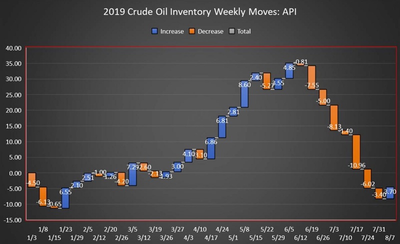 За отчетный период длиной 34 недели данные API показывают, что чистое снижение составляет 7.98 млн. баррелей. Цены на нефть росли во вторник перед публикацией данных, демонстрируя отскок после достижения минимумов 2019 года на прошлой неделе по мере ухудшения перспектив спроса из-за торговой войны США и Китая. WTI прибавляет 11 центов до $56.25, Brent прибавляет 43 цента до $60.17.