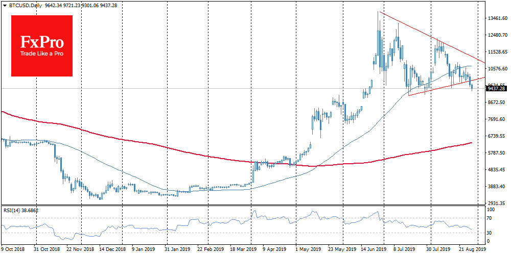 Ситуация на рынке криптовалют выглядит все более плачевно. Ночью биткоин обвалился сразу на $600. Участники рынка ожидали, что быки начнут выкупать BTC на локальных минимумах, но этого не случилось. Утром в четверг первая криптовалюта продолжает тестировать уровни поддержки, достигая $9,400 и теряет за последние сутки 7%. Падение усугубляется ростом торговых объемов. В середине июля биткоин уже падал к нижней границе $9K, однако тогда получал поддержку. В случае пробивания $9K может открыться путь для снижения вплоть до $6K, где проходит двухсотдневная скользящая средняя.