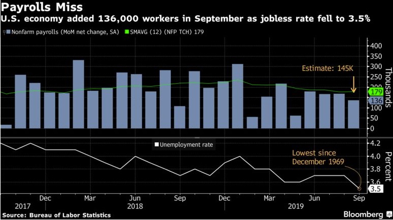 NFP за сентябрь оказались хуже ожиданий. Рекордно долгий рост и далее замедляется, хотя уровень безработицы упал до минимума за полвека. Суммарно занятость выросла ниже прогнозов на 136K, усиленная тысячей временных госслужащих, которые привлекаются для подготовки проведения переписи населения 2020.