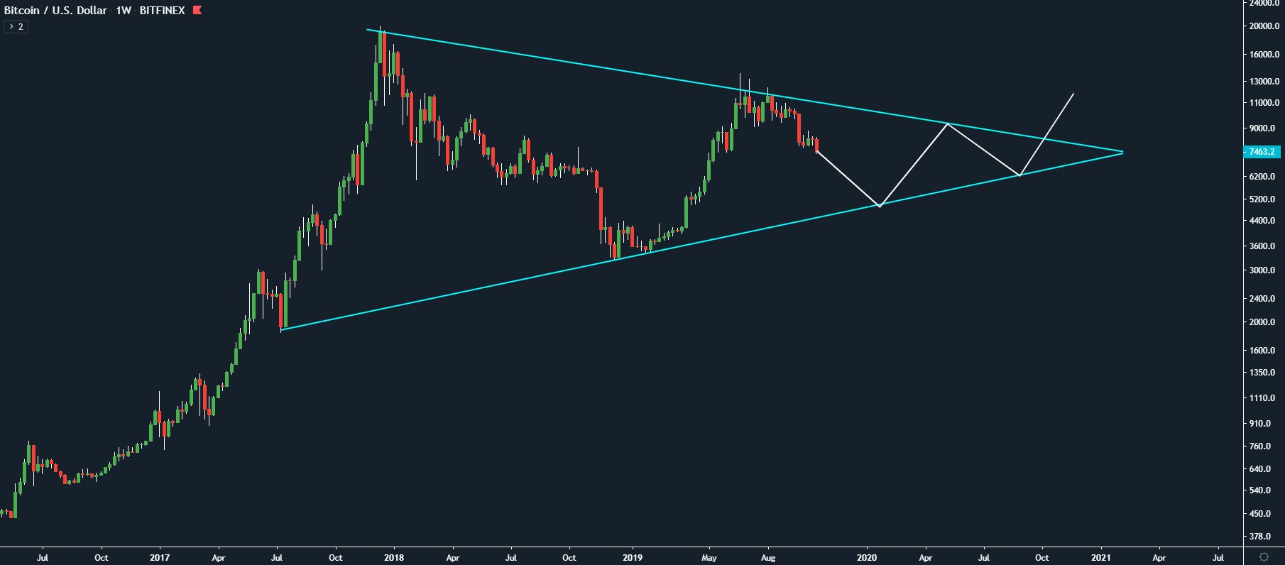 Уменьшение масштаба графика биткоина показывает, что эталонной криптовалюте могут понадобиться еще 365 дней, чтобы прийти к полномасштабному прорыву. Известный криптоаналитик Тедди Клепс считает, что недельный график биткоина отражает вероятность массивного бычьего импульса. В перспективе структура флаг указывает на паузу в ценовой динамике в середине пути, за которой следует сильный прорыв в направлении тренда. Тем не менее, если формация длится более 4 недель, трейдеры обычно начинают воспринимать флаг в качестве симметричного треугольника.