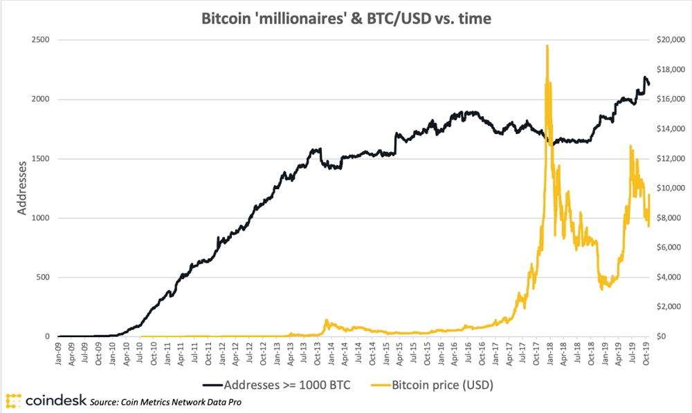 Bitcoin Rich List - список крупнейших адресов с активами более чем на 1,000 BTC, демонстрировал рост в течение последних 12 месяцев. Есть вероятность, что эта ситуация отражает приток крупных инвесторов. По данным Coin Metrics, этот индикатор зарегистрировал рост на 30 с сентября 2018 года. Даже с учетом корректировки адресов, принадлежащих биржам, данные демонстрируют аналогичный рост.