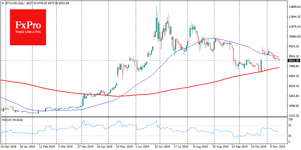 Если перетягивание каната между быками и медведями окончится победой последних, следующей ближайшей поддержкой может выступить круглый уровень $8K, а затем – уровень 200-дневной скользящей средней на $7,800.
