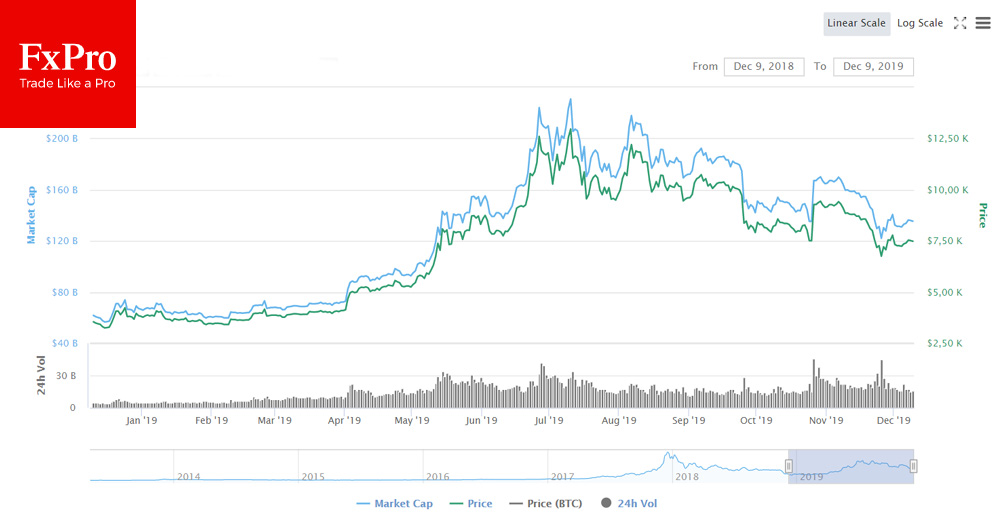 Хотя биткоин демонстрирует последовательные попытки отскочить вверх к $8K, пока что мы видим, что каждый раз криптовалюта сталкивается с давлением продавцов. Если брать широкую перспективу, то стоимость эталонной криптовалюты сейчас на 108% по сравнению с уровнями год назад. Тем не менее, с момента достижения максимума в начале июля 2019, явно прослеживаются волны коррекций. Сперва с $12K до $10K, затем с $10K до $8K, затем с $8K уже до $6.5K.