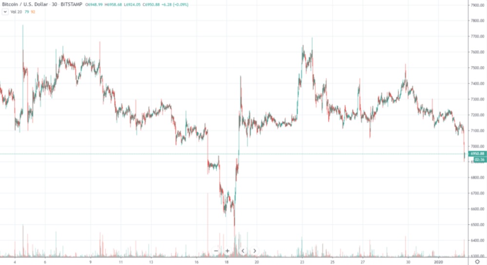 Курс биткоина упал до нового минимума за многие недели в четверг, продолжая торговаться независимо от широкого движения рыночных сил. Новое снижение произошло на фоне подпитки центральными банками ралли акций, золота и американского доллара. Курс биткоина коснулся внутридневного минимума на уровне $6,900 на криптобирже Bitstamp, что стало минимальным уровнем более чем за 2 недели. Крупнейшая криптовалюта по рыночной капитализации в последнее время колебалась около $6,950, просев на 3.2% за сутки.