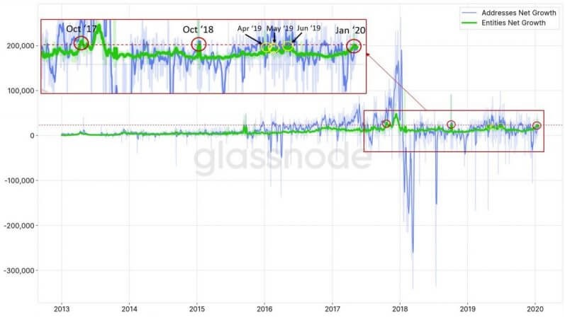 С учетом этого, Glassnodes составили график ежедневного чистого роста субъектов, использующих биткоин. Кроме того, эта метрика учитывает нулевые балансы, однако до этого там были средства. Было неудивительно увидеть, что курс биткоина рос вместе с ежедневным ростом числа пользователей.