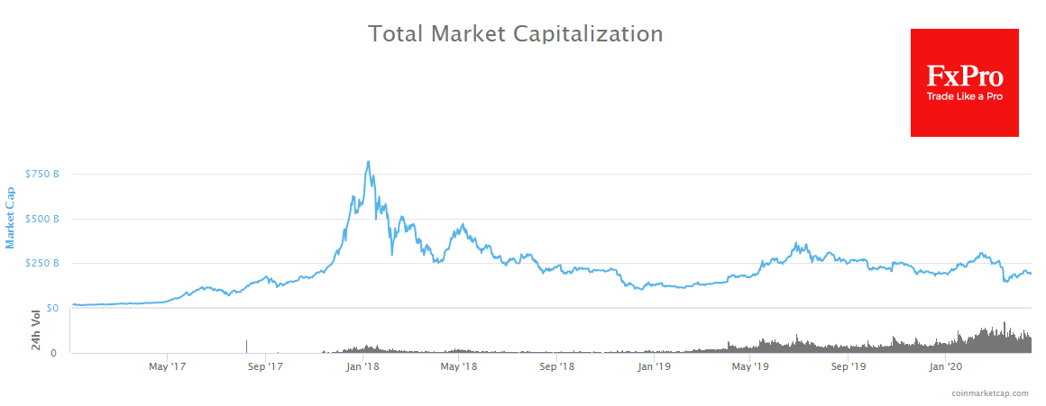 Биткоин сохраняет свое главное качество - волатильность. После снижения к $6500 в начале дня, биткоин показал столь же резкий отскок к выше $7100. Усиление позиций первой криптовалюты сопровождается повышением торговых объемов, подтверждая силу позитивной динамики. Альткоины сперва повторяли за биткоином снижение, теперь переключились на рост. Наиболее оптимистичную картину демонстрирует Ethereum (ETH) и EOS с ростом на 6% и 7% соответственно. Суммарная капитализация крипторынка за последние сутки также сильно колебалась, стабилизовавшись вблизи отметки $200 млрд.