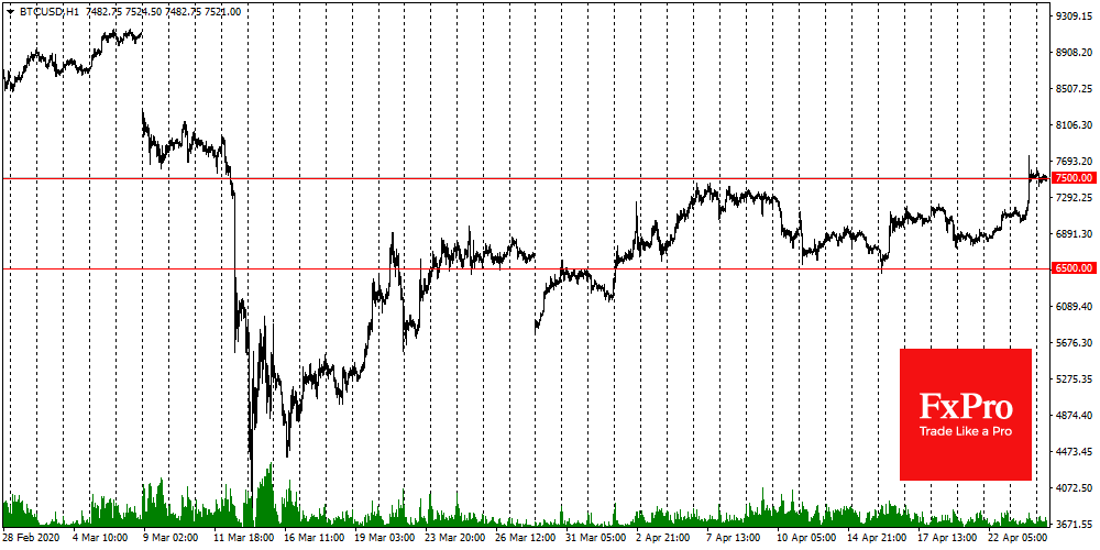 Вчерашнее возвращение биткоина выше $7K совпало с отскоком нефти и ростом фондового рынка. Однако уже сегодня ценовая динамика первой криптовалюты идет вразрез с рынком акций. Весьма вероятно, что на стоимость биткоина начнут оказывать внутренние факторы, главным из которых является приближение халвинга, который произойдет через 18 дней.