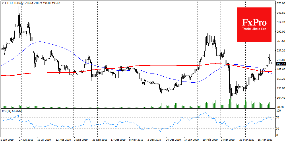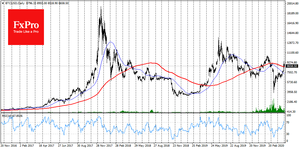 Провал под эту линию в конце февраля положил старт 3-кратному падению цены в последующий месяц. Еще раньше, в ноябре 2019, курс BTCUSD снизился на 18% после закрепления под 200-дневной MA. В мае 2018-го снижение примерно с этих же уровней удалось остановить лишь семь месяцев спустя, в области $3300.