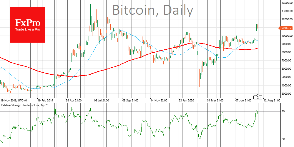 Уровни выше 11000 – являются максимумами более чем за год, и, выглядят достаточно высокими для аккуратной фиксации прибыли. Ценовой максимум 2020 года был достигнут биткоином на уровне $11,400, и в данный момент динамика похожа на ситуацию с драгоценными металлами: в диапазоне от легкого снижения до нуля. Индекс жадности и страха находится в режиме “экстремальная жадность”, что по задумке индекса указывает на скорый разворот тренда, тем не менее, биткоин вполне может показывать рост и находясь в технических условиях перекупленности. Формально сигналом распродажи будет возвращение RSI в область ниже 70 против текущих 75.
