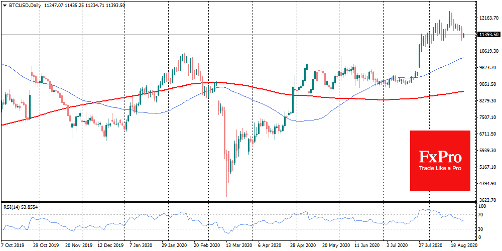 Биткоин все же переключился в состояние коррекции, пробив важный уровень поддержки на $11,500. Тем не менее, достигнув в какой-то момент минимальной точки около $11,100, эталонная монета привлекла покупателей. В итоге, в среду утром биткоин демонстрирует снижение за сутки на 3% до $11,400. Хотя монета остановила снижение около $11K, все же нельзя исключать усиления давления продавцов. Следом за биткоином в коррекцию перешли и все остальные криптовалюты.