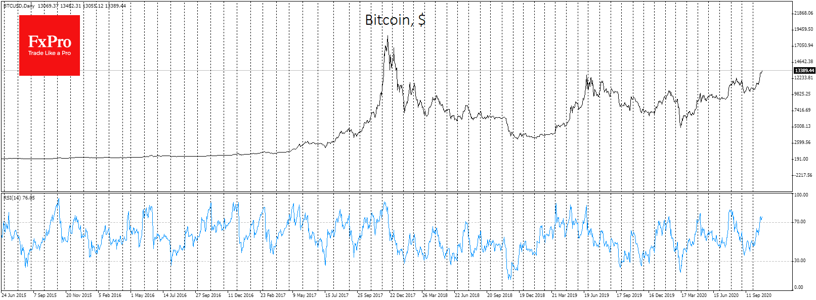Биткоин сейчас в лучшем положении для продолжения роста, выйдя в область максимумов последних почти трёх лет. Совсем недавно он вышел в область выше 13000, и до сих пор демонстрирует мало признаков коррекционного отката. Биткоин проходит тесты медведей, однако пока что каждый раз после погружения ниже $13K привлекает спрос покупателей, которые быстро выкупают провалы. За этими покупками стоят фундаментальные факторы.