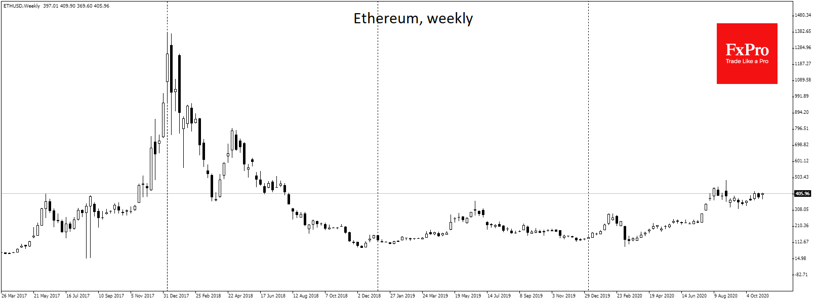 Биткоин прибавлял последние 5 недель, включая прошлую, одной из худших для акций за последние месяц. Суммарная капитализация цифровых валют на этой неделе превысила психологический барьер $400 млрд. В последний раз крипторынок был выше этой отметки в конце апреля 2018 года. Фоном Биткоину оказывают поддержку новости о росте Grayscale Bitcoin Trust, который сейчас располагает почти 500K BTC стоимостью около $6.7 млрд. Около 70% притока средств в Grayscale направляются в Bitcoin Trust.
