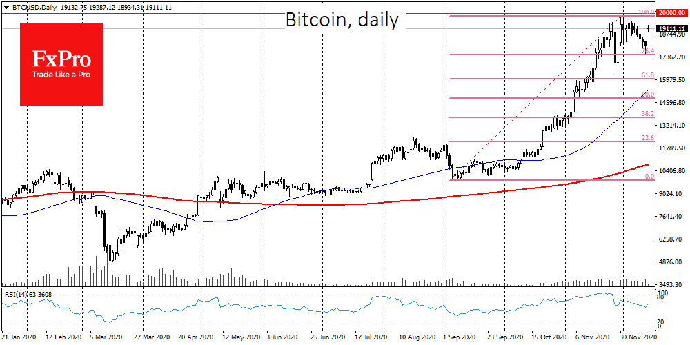 Технический анализ вновь подтвердил свое основополагающее влияние на биткоин. Коррекция последних дней растеряла силу на подходе к уровню 76.4% от ралли сентября-ноября, которая считается первой линией коррекции при бурных трендах роста. Если так, то уже на этой неделе биткоин может вновь тестировать область $20,000.