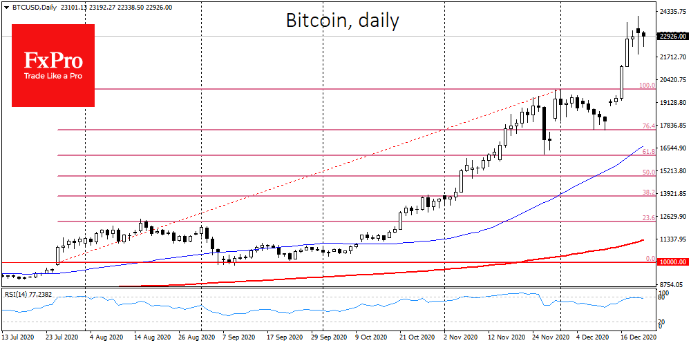 Институциональные инвесторы оказывают сильное влияние на ценовую динамику крипторынка, поэтому можно предположить, что в данный момент мы видим некую незначительную ротацию активов в связи с новостями вокруг мутации вируса, которые сильно ударили по глобальным настроениям рынков, оказывая давление на акции, сырье и другие активы, в число которых попал и Биткоин.