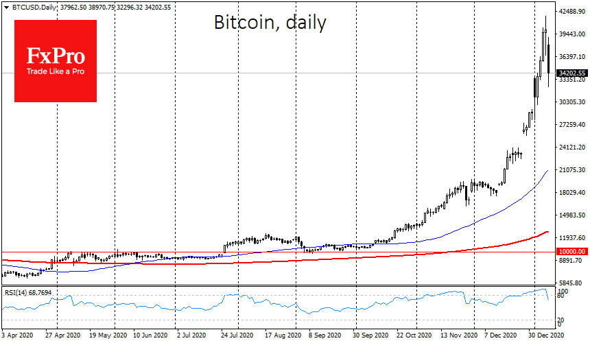 Мировые рынки начали неделю достаточно тревожно, что не преминуло сказаться на биткоине. К началу торгов на европейских рынках курс опускался до $32.3 тыс. (-23% с пятничного пика). Этот провал стоит связывать с усилением тяги в защитные бумаги на мировых рынках. Ралли доходности американских Treasuries идет с начала прошлой недели, но к ее концу стало оказывать влияние на многие другие рынки, высасывая с них ликвидность.