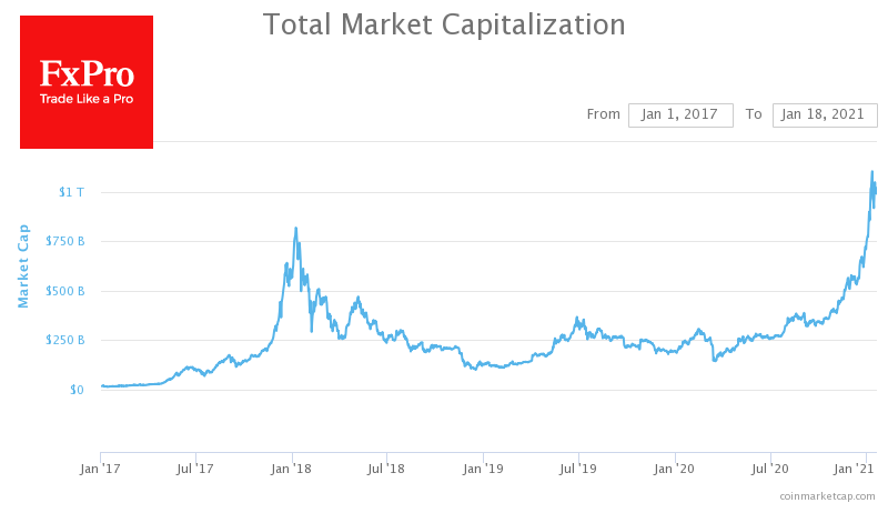Суммарная капитализация крипторынка держится едва выше $1 трлн., периодически падая ниже этого уровня из-за волн коррекций. Однако рынок колеблется около исторического максимума, который не удавалось установить даже во времена ралли в конце 2017 года.