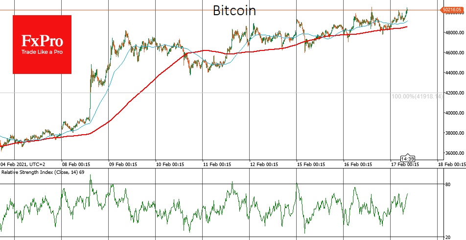 Биткоин вчера пересекал черту $50K, но был отброшен ниже. В среду утром мы видим новые попытки забраться выше. Динамика роста имеет достаточно умеренный характер, не сталкиваясь с существенными коррекциями, что дополнительно цементирует рост.