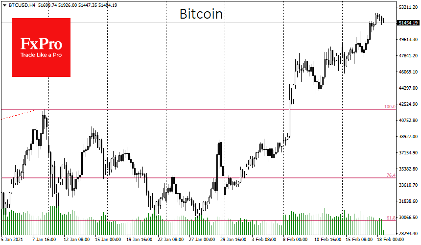 Крипторынок постепенно вспоминает давно забытое чувство ажиотажа и FOMO. По мере роста Биткоина продавцов на рынке становится все меньше. Рынок заставил уйти наиболее осторожных инвесторов еще в диапазоне $20-$30K. Около $50K продавали уже оптимисты. После уверенного преодоления важнейшего технического и психологического уровня большинство участников взяли паузу, так как с одной стороны, цена остановилась около $52K, и дальнейший рост пока не фиксируется. С другой стороны, все видят, что медведи так и не вышли на главную сцену, и продавцы сейчас не пытаются вытолкнуть Биткоин ниже круглого уровня.