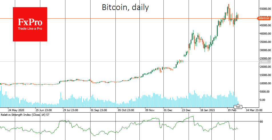 Биткоин прибавляет 1% за сутки до $49,300, но цена при этом снижается с вечера среды, когда достигала отметки $52,500. Важным фактором давления стало очередное снижение рынка акций в США во главе с технологическими компаниями. Акции Tesla и множества других компаний имеют тесную и обоюдную связь в последние недели, так что давление на них тут же распространяется на крипторынок.