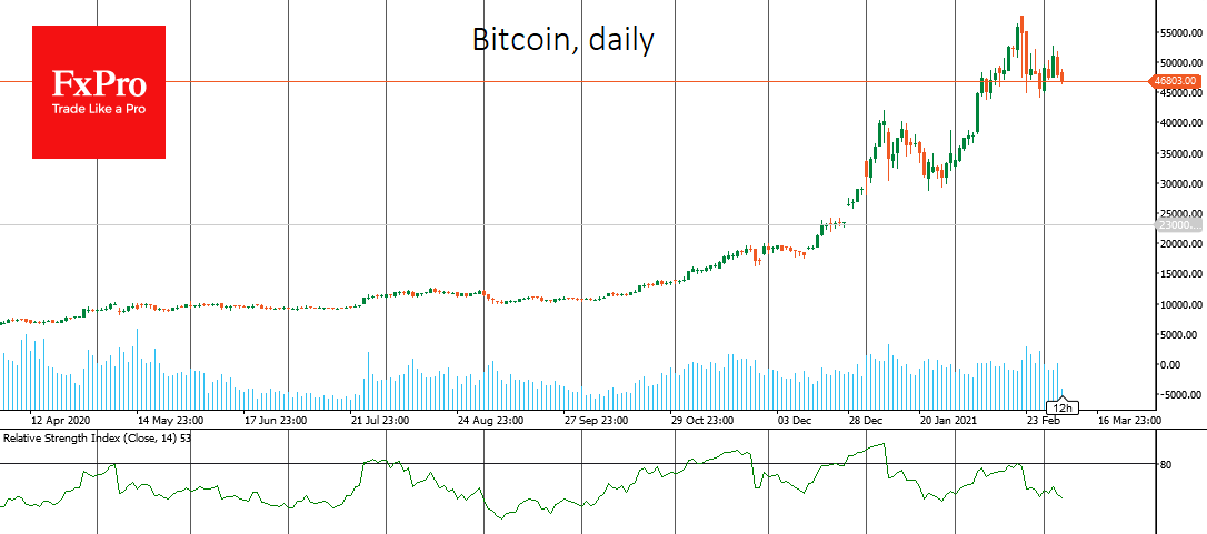 Биткоин теряет 4.5% за последние сутки, опустившись ниже $47,000. Монета столкнулась с усилением давления после очередной попытки забраться выше $50K за счет сокращения спроса на рисковые активы на мировых рынках. Однако в данном случае биткоин лишь реагирует на внешние раздражители. Медведям не хватает потенциала развить мощную коррекцию, как это было в январе.