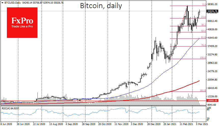 На текущем этапе даже неудачные попытки протестировать установленный недавно исторический максимум около $57K буду восприниматься участниками рынка с положительной стороны.