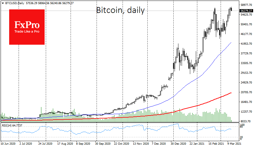 Биткоин прибавляет за последние сутки около 3% и торгуется немногим выше $57k. Повторный выход в область глобальных максимумов на $58k усилил давление продавцов. На данном этапе оно очень незначительное, и весьма вероятно, что в ближайшее время мы увидим тестирование $60k, где Биткоин столкнётся с настоящим испытанием доверия инвесторов.