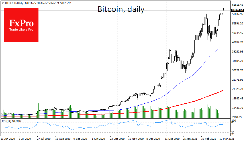 13 марта Биткоин установил исторический максимум на $61,500, после чего начал корректироваться. Тем не менее, снижение оказалось крайне небольшим, учитывая масштабы роста.