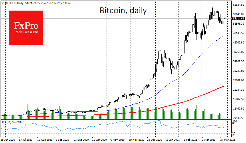 После провала Биткоина до $51K быки показали, что не намерены отступать, толкнув монету вверх. Однако главная хорошая новость заключается даже не в отскоке, а в способности криптовалюты зацепиться за высокие уровни. В течение выходных Биткоин торговался в диапазоне $55K - $57K. В начале рабочей недели монета показывает за сутки близкую к нулевой ценовую динамику и меняет руки за $55,600.