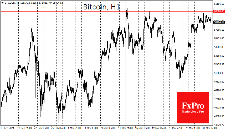 В последний день марта Биткоин снова приближался к пороговым $60K, однако волна продаж почти мгновенно вытолкнула эталонную криптовалюту к $57K. Третий день BTCUSD словно упирается в невидимый потолок на подступах к $60K. В то же время сравнительно неглубокие откаты позволяют пока говорить о консолидации сил покупателей перед дальнейшим витком роста, а не о каких-то фундаментальных трудностях с дальнейшим ралли.