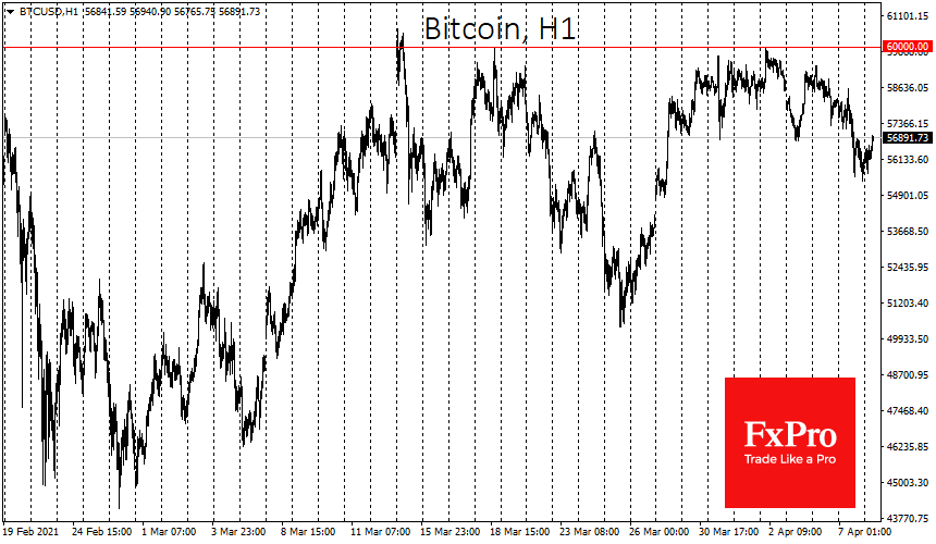 К утру четверга Биткоин снижается почти на 2% и торгуется около $57K. Биткоин весьма сильно напугал вчера участников рынка, начав резко снижаться вместе с рынком альткоинов. Эталонная криптовалюта просела почти с $59K до $56K, где коррекция и остановилась.