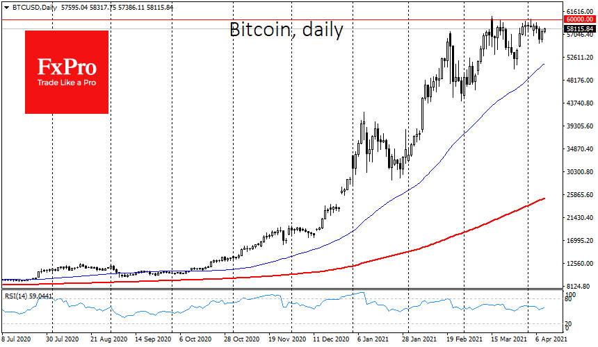 Крипторынок пережил краткосрочную локальную коррекцию и продолжает осторожное движение вверх. Наиболее выраженная положительная динамика заметна среди альткоинов, однако и в отношении Биткоина негативного фона нет. Эталонная криптовалюта прибавляет за последние сутки более 3% и торгуется около $58,200, что можно считать неплохим результатом после стремительного погружения и отскока.