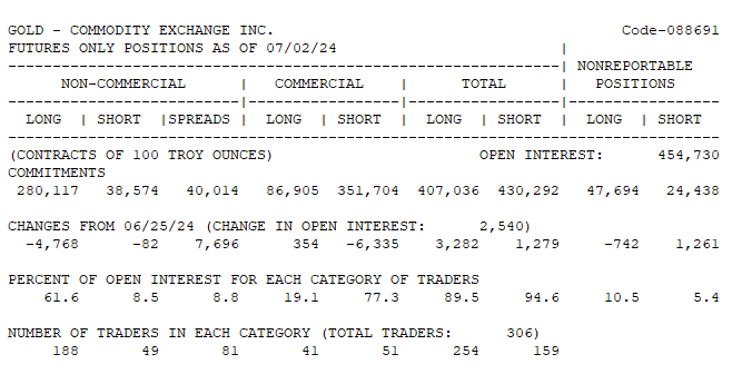 Хеджеры (COMMERCIAL) сократили чистую позицию на продажу контрактов по золоту на 6.7 тыс. контрактов до 264.8 тыс. Хеджеры-операторы сократили чистую позицию на продажу также после почти 7-недельного наращивания.