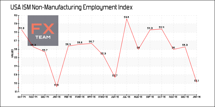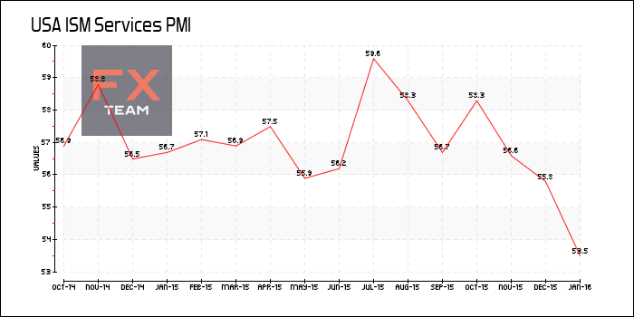 Согласно обзору, опубликованному Institute Supply Management, композитный индекс ISM для непроизводственной сферы США составил 53,5 пункта в январе 2016 г. по сравнению с 55,8 пункта в предыдущем месяце.
