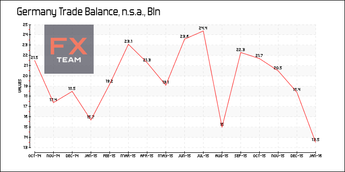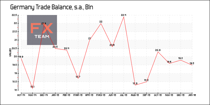 С учетом календарных и сезонных факторов профицит торгового баланса Германии составил 18,9 млрд. евро за январь 2016 г. по сравнению с 20,3 млрд. евро в предыдущем месяце, сообщает Федеральное управление статистики. Ожидалось снижение профицита до 19,2 млрд. евро.