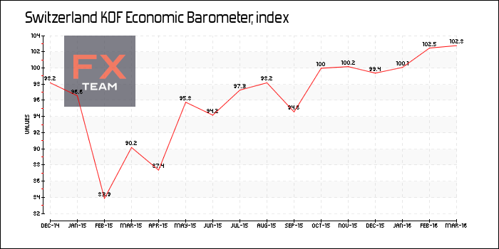 Индекс ведущих экономических индикаторов Швейцарии от KOF составил 102,5 пункта за март 2016 г. по сравнению с 102,6 пункта в феврале (пересмотрено с 102,4 пункта). При этом аналитики прогнозировали снижение показателя до 101,9 пункта.